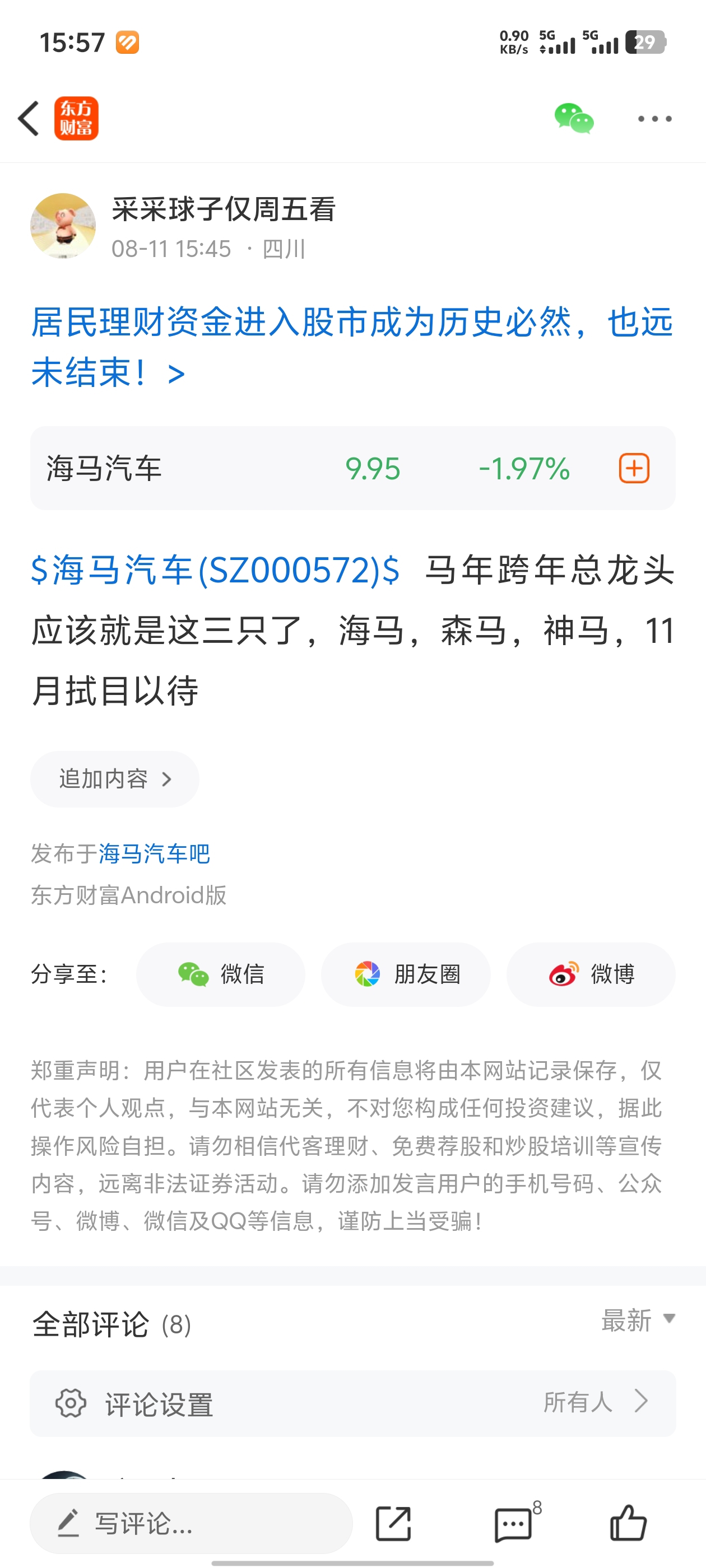 $森马服饰(SZ002563)$ 目前看海马走的周线级别主升浪,森马很可能走月线级别主升浪,今天干了两层仓森马,目标价12元卖出