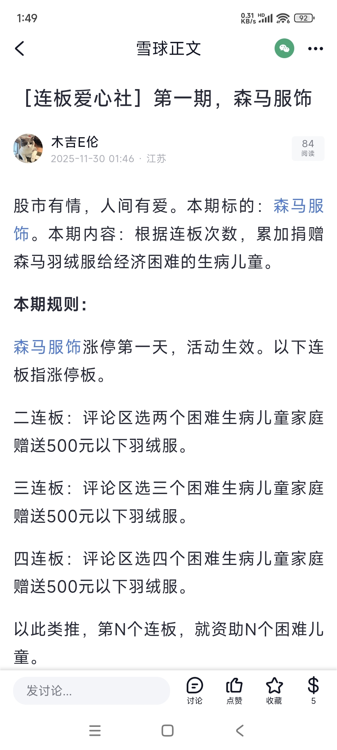 $森马服饰(SZ002563)$ 有经济困难的生病儿童家庭,连板后去评论,可以领羽绒服。