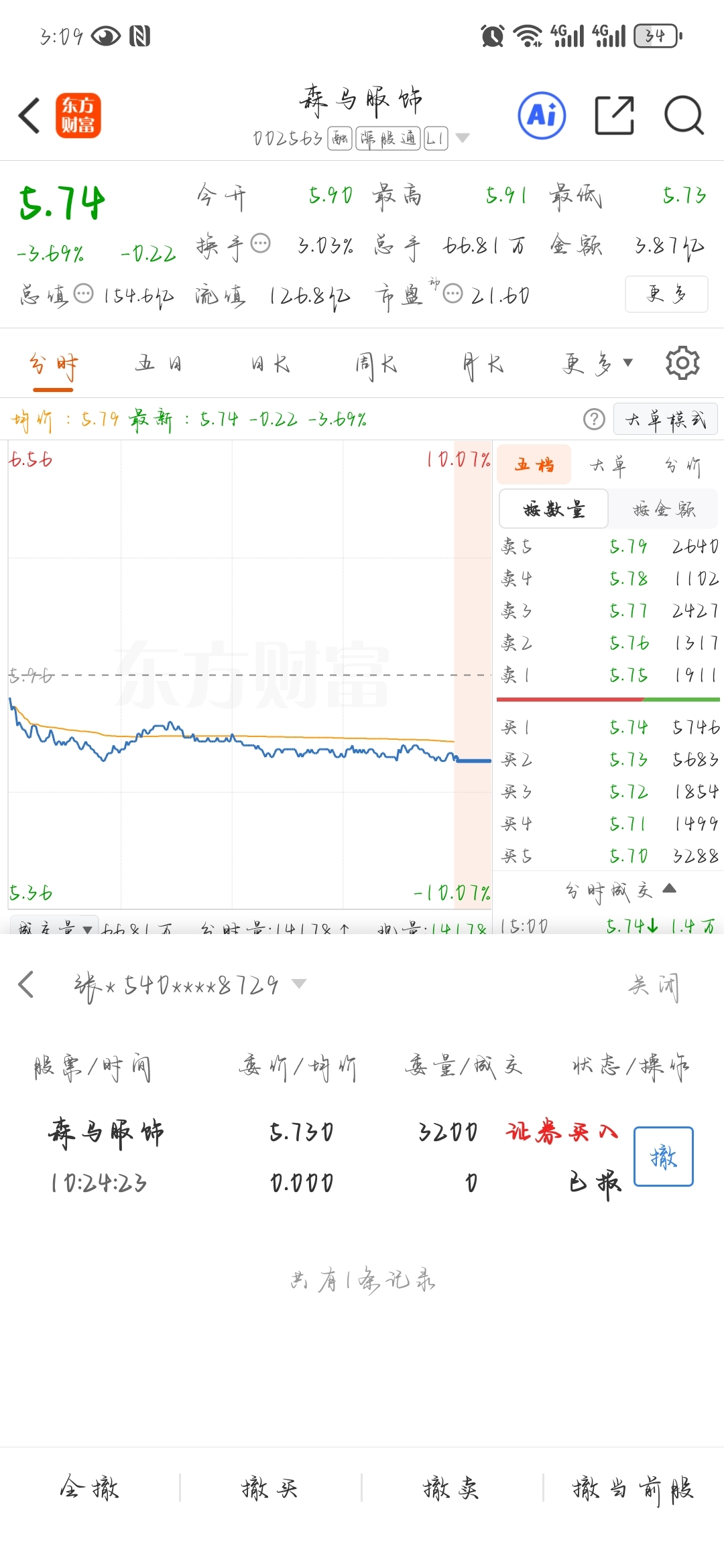 $森马服饰(SZ002563)$ 10点半挂的5.73;今天差一分钱没买进