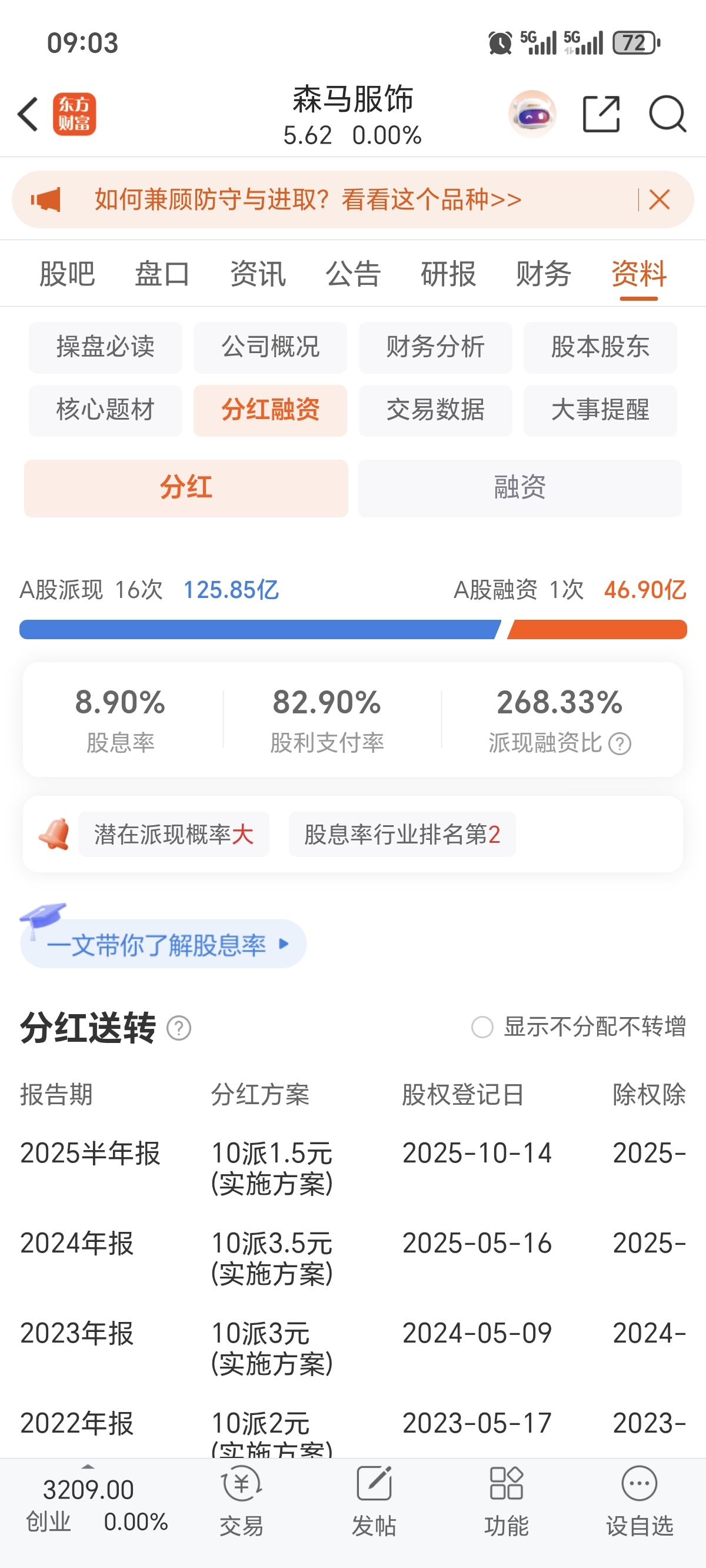 $森马服饰(SZ002563)$ 坚定持有,这种良企业融了40多亿,分红了120多亿,整个A股都找不出几家了!