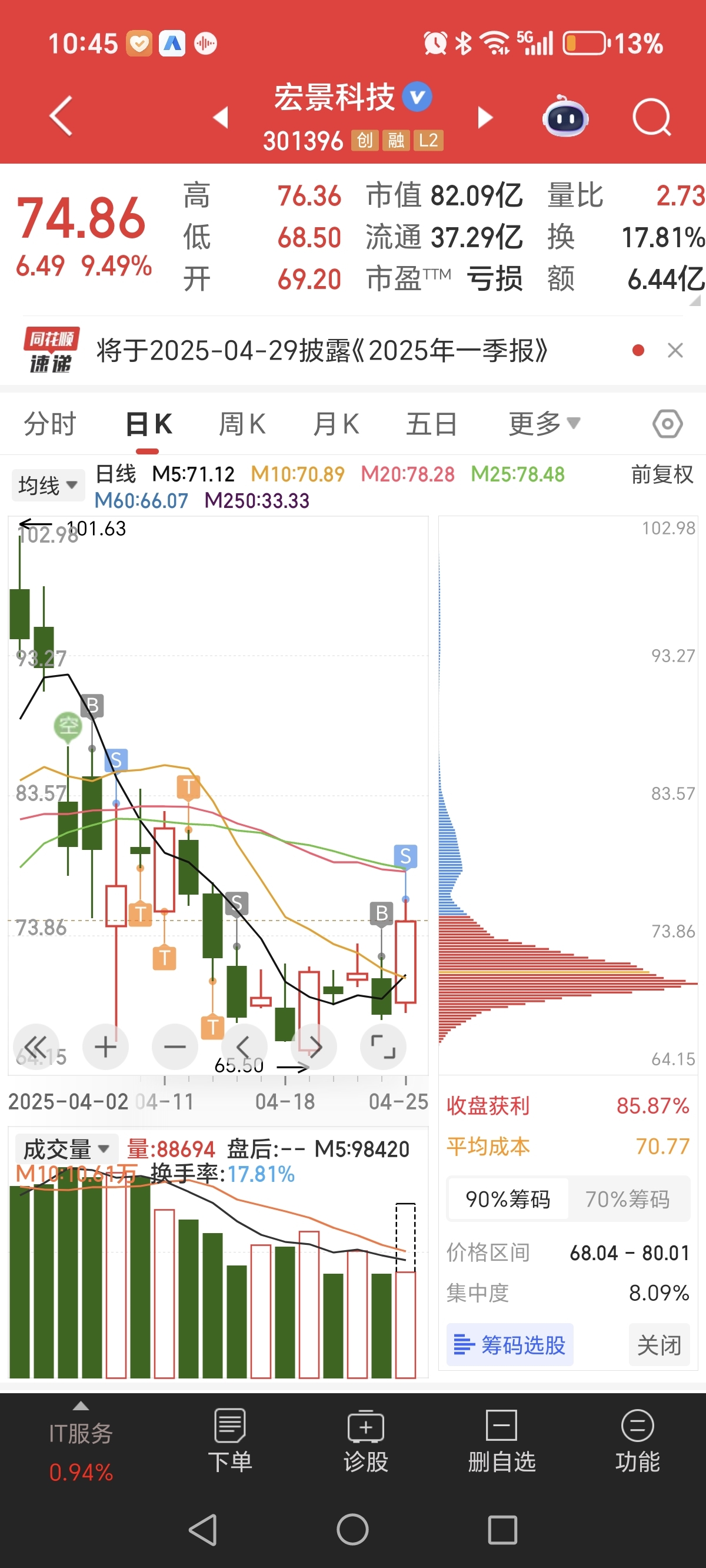 昨天涨停板,全仓清掉进了宏景科技。今天11个点清掉,水下四个点接回,天沃科技