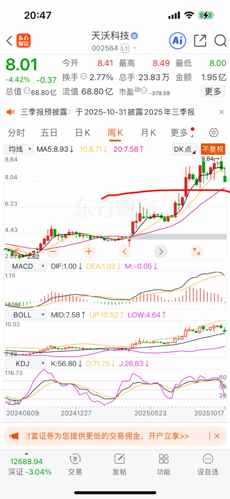 $天沃科技(SZ002564)$ 跌周线才会止跌