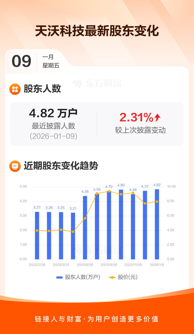 天沃科技最新披露数据显示,截至1月9日公司股东户数为4.82万户,较上期(2025年12月31日)增加1089户,增幅为2.31%。户均持有流通股数量由上期的1.82万股下降至1.78万股,户均持股金额由上期的14.02万元增加至14.15万元。