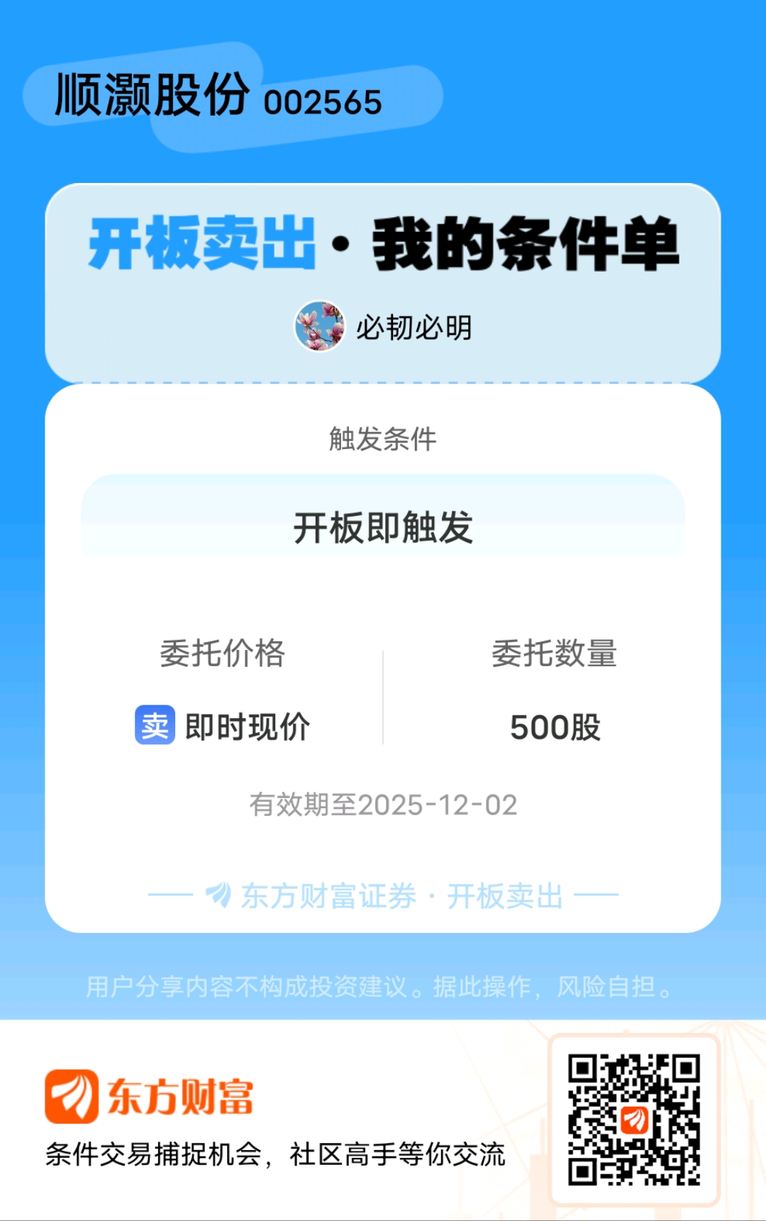 #条件单交流# #开板卖出晒单# 一位股神设置了一个开板卖出条件单,接下来就是见证奇迹的时刻~$顺灏股份(SZ002565)$