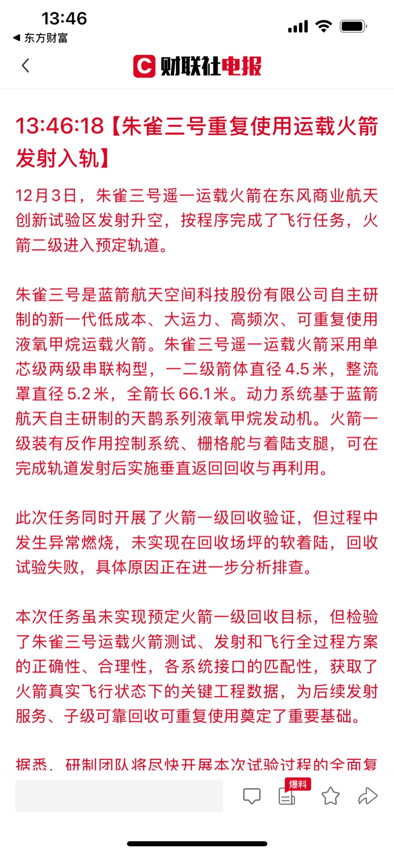 $顺灏股份(SZ002565)$ 朱雀三号火箭顺利发射入轨!为东大的航天事业点赞!