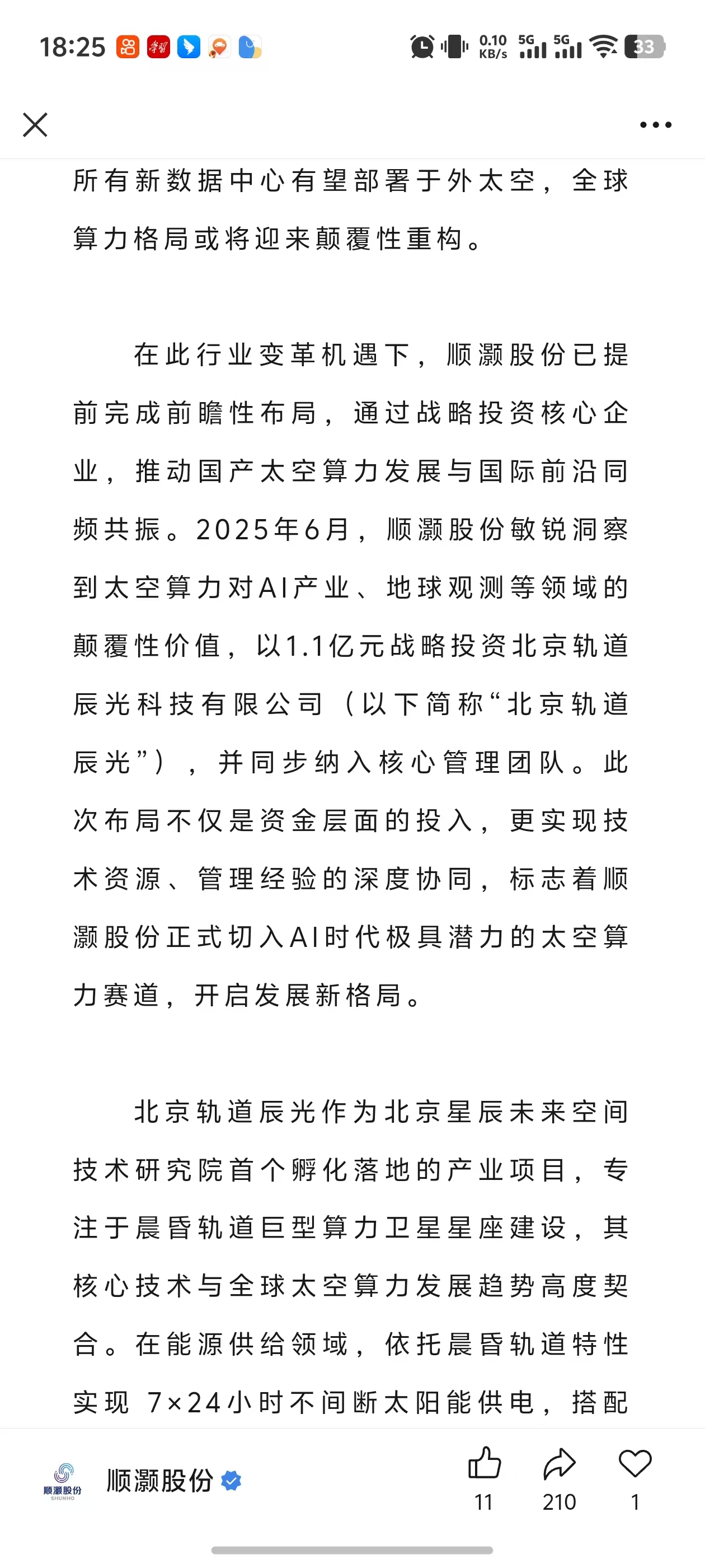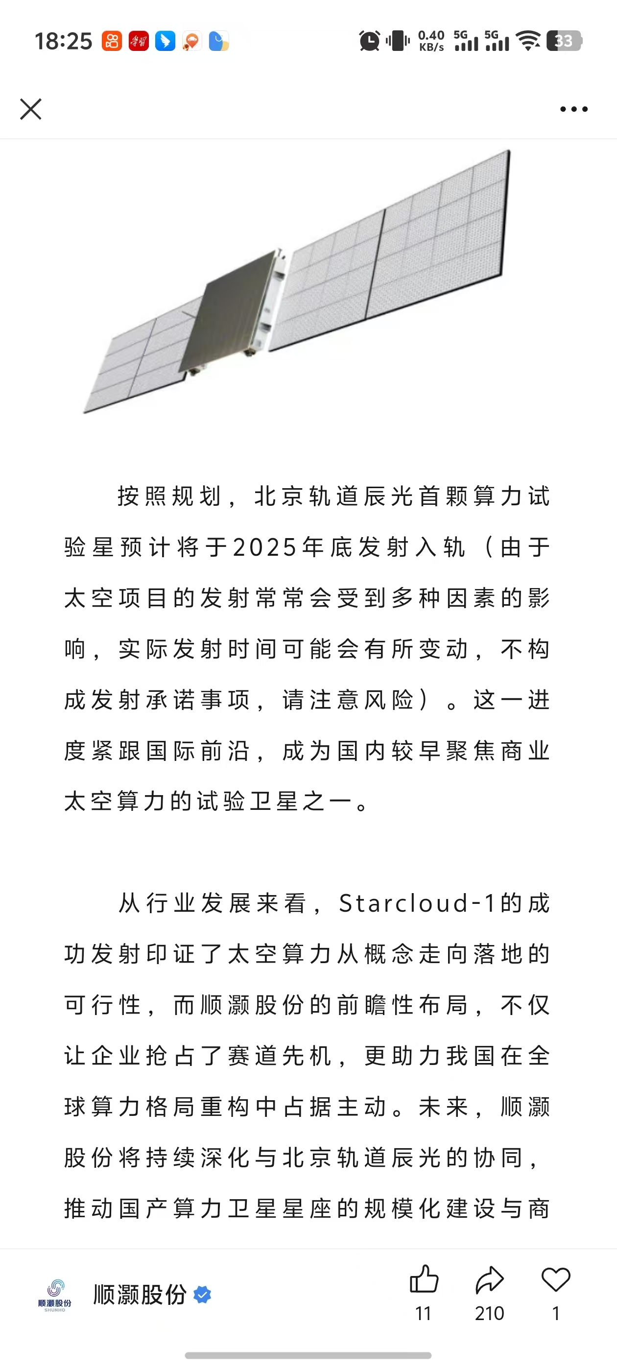 很多人不知道这个顺hao股份炒作的是啥,我告诉你,看看有多么领先,太空算力卫星颠