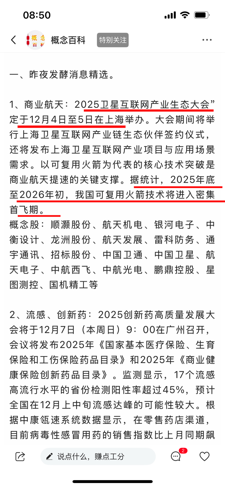$顺灏股份(SZ002565)$ 今天和明天将在上海举行“2025卫星互联网产业生态”大会。2025年底到2026年初,我国可复用火箭技术将进入密集首飞期!