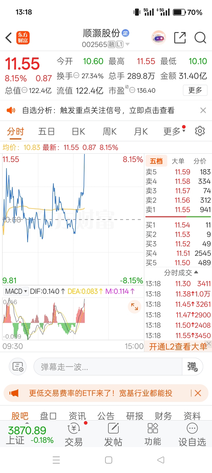 $顺灏股份(SZ002565)$ 上午通知各位10.5-10.9进的朋友,继续拿好,等待冲高,一起吃肉