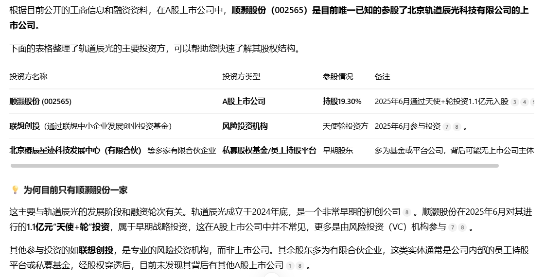 唯一性:顺灏股份(002565)是目前唯一已知的参股了北京轨道辰光科技有限公司的