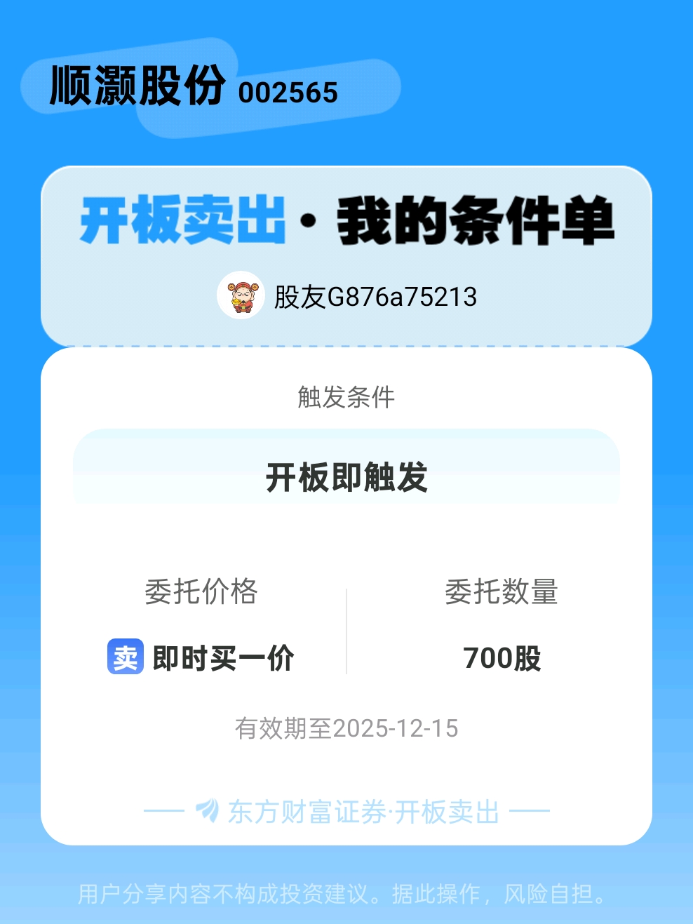 #条件单交流# #开板卖出晒单# 一位股神设置了一个开板卖出条件单,接下来就是见证奇迹的时刻~$顺灏股份(SZ002565)$