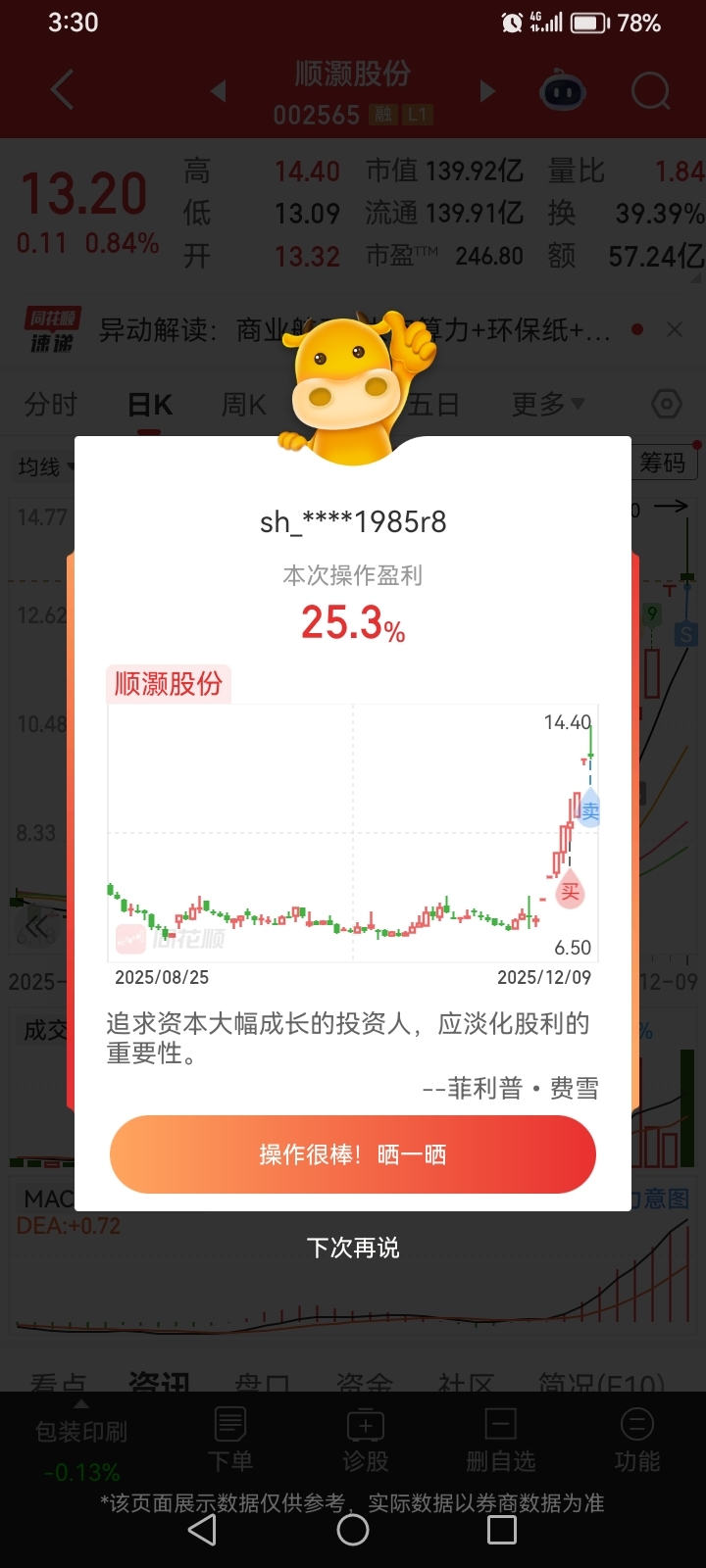 $顺灏股份(SZ002565)$ 清仓,有机会再来