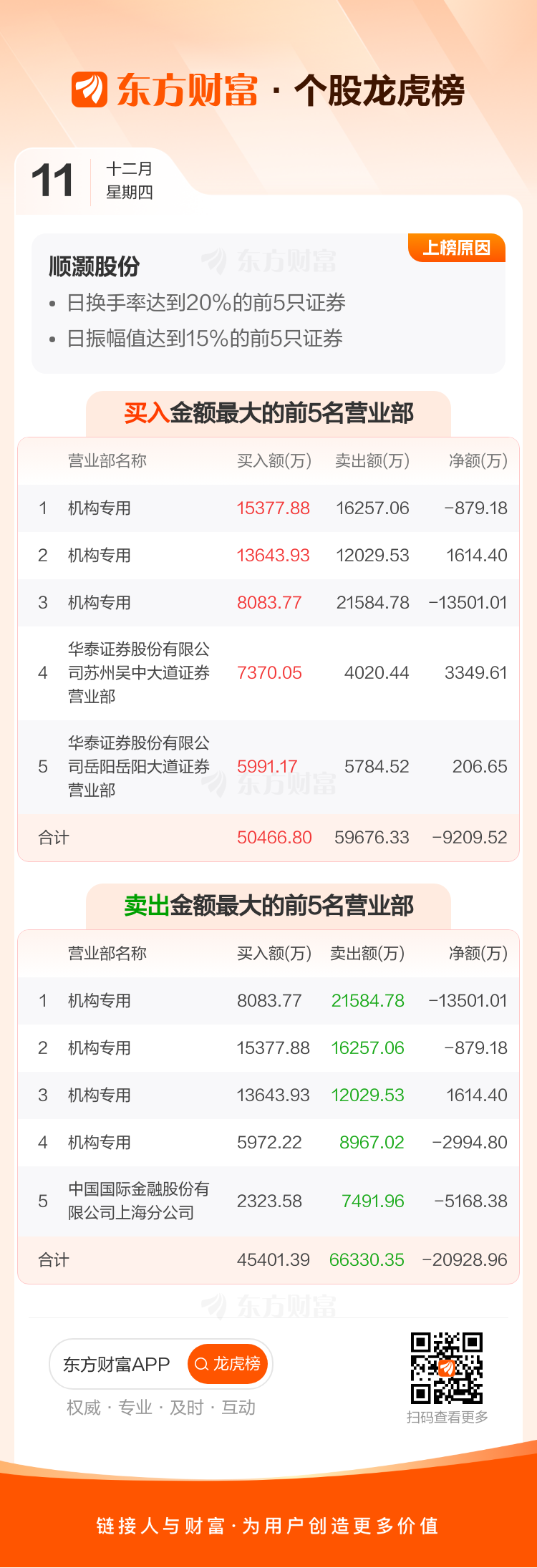 交易所2025年12月11日公布的交易公开信息显示,顺灏股份因成为日换手率达到20%的前5只证券、日振幅值达到15%的前5只证券上榜。顺灏股份当日收报14.5元,涨跌幅7.65%,偏离值34.79%,换手率34.79%,成交额50.53亿。