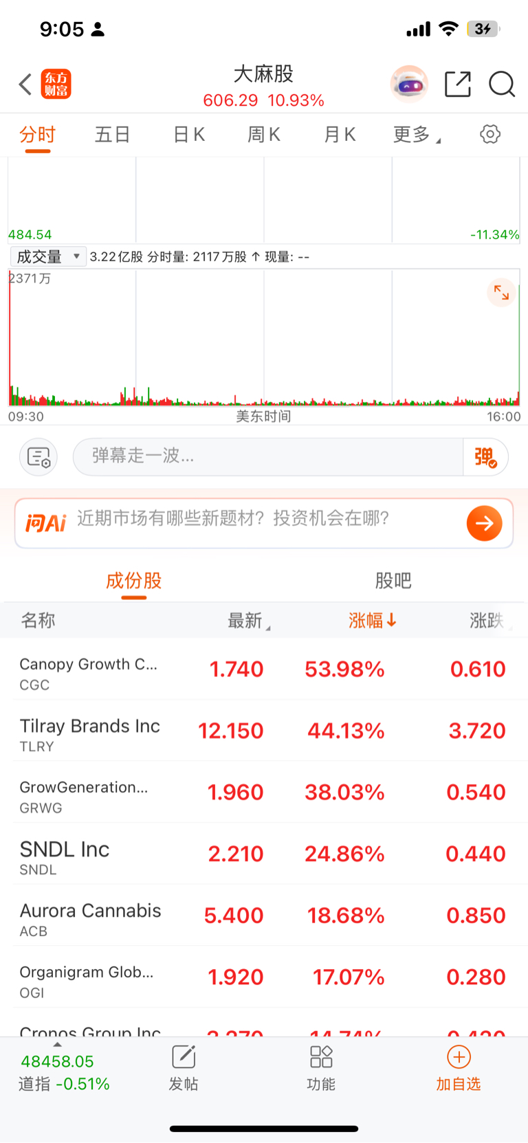 昨天美股科技股暴跌,大麻股有利好,暴涨