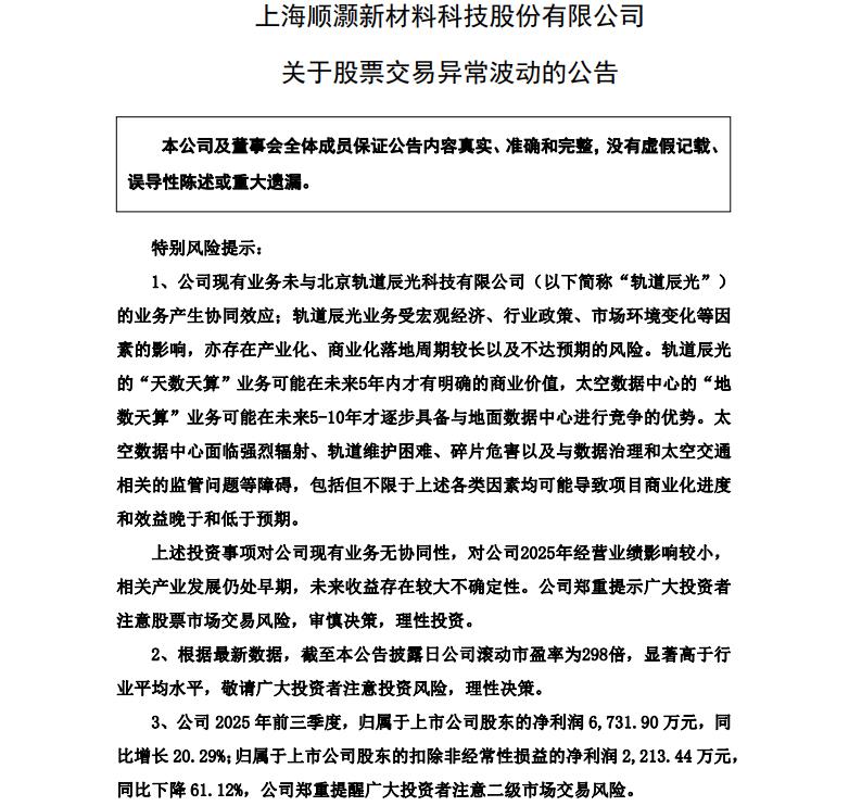 11天7板顺灏股份:太空数据中心面临强烈辐射等因素可能导致项目商业化进度和效益晚于和低于预期