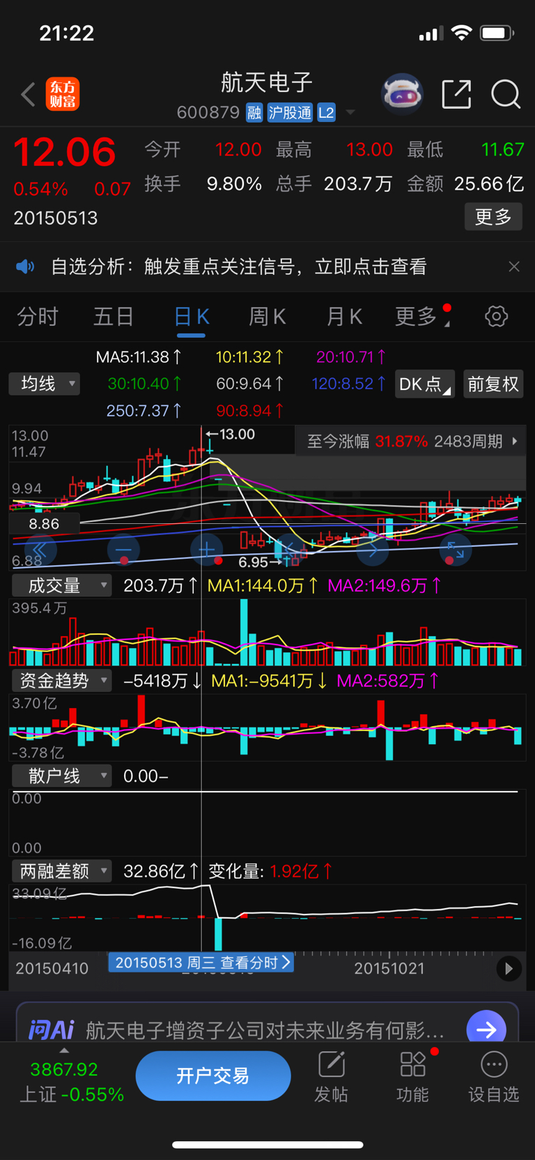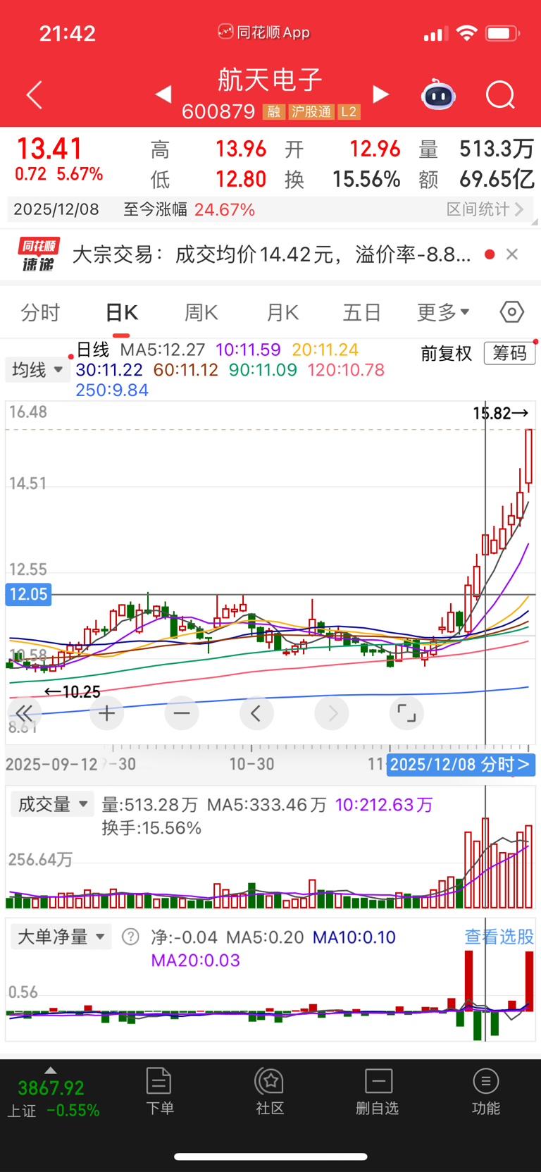 12月8日上周一航天电子K线图,打掉10年前2015年牛市的历史高点13元,创出历史新高13.96元;