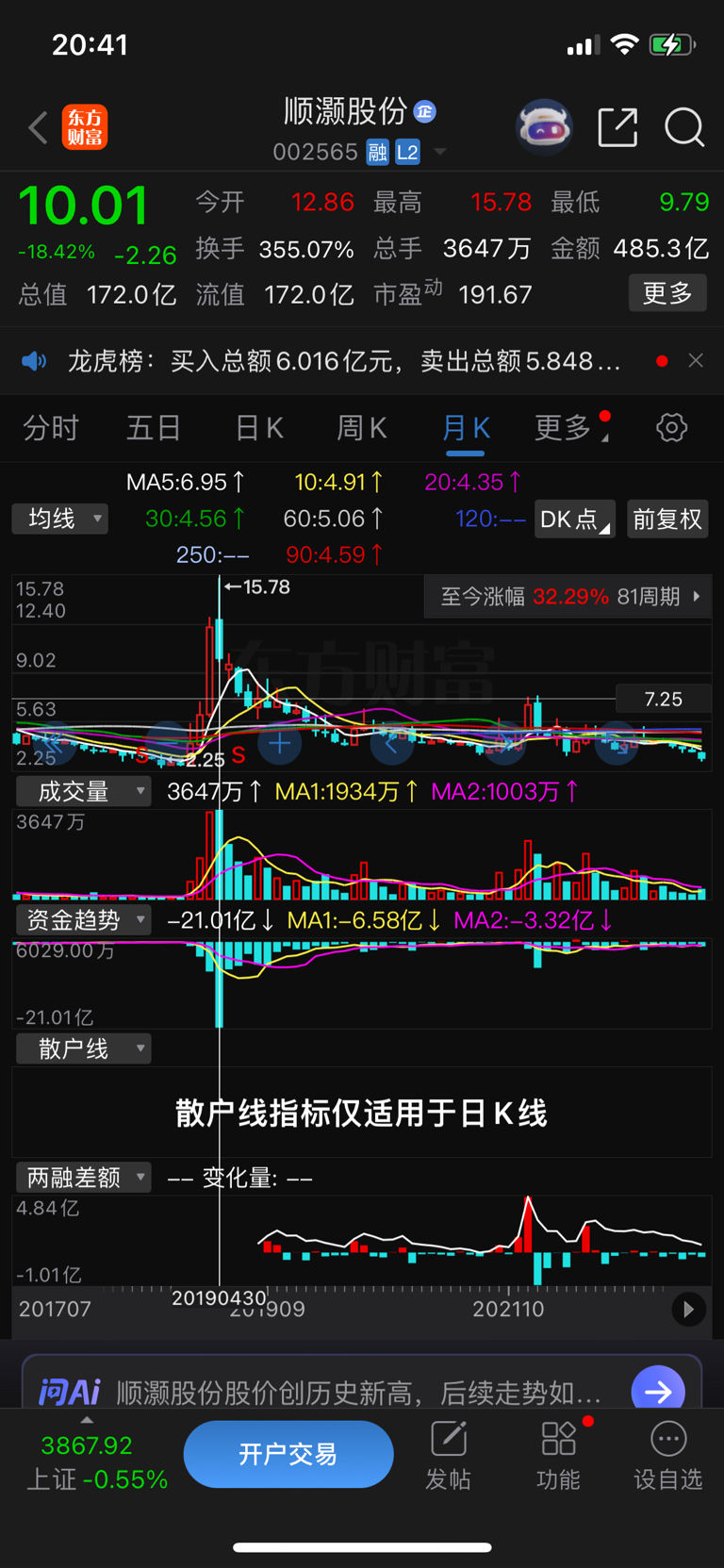 顺灏股份最大的问题是周五不该早早拉出涨停板/害我还卖飞掉,更不该在没有大换手的情况下严重缩量封死涨停板,这导致在前高15.78元附近的套牢筹码没有充分换手,15.78元前高那天是2019年4月18日,那时成交量达2.5亿股成交额达38亿+,比周五缩量涨停的成交量和成交额都要大,