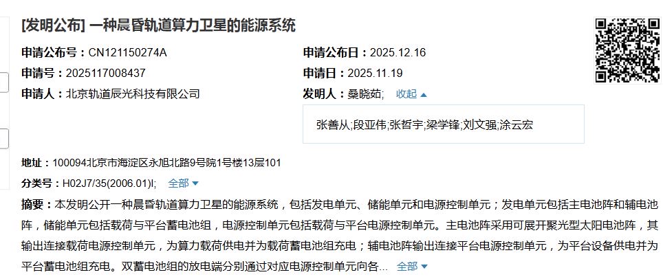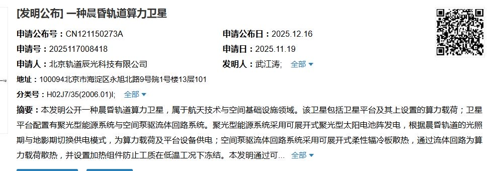 2025年12月16日晚,轨道辰光公布2项重大专利:【一种晨昏轨道算力卫星】 【一种晨昏轨道算力卫星的能源系统】。轨道辰光不仅是北京16GW太空巨型数据中心的建设方和后续运营方,同时也是掌握能源&散热等核心技术的领军企业。