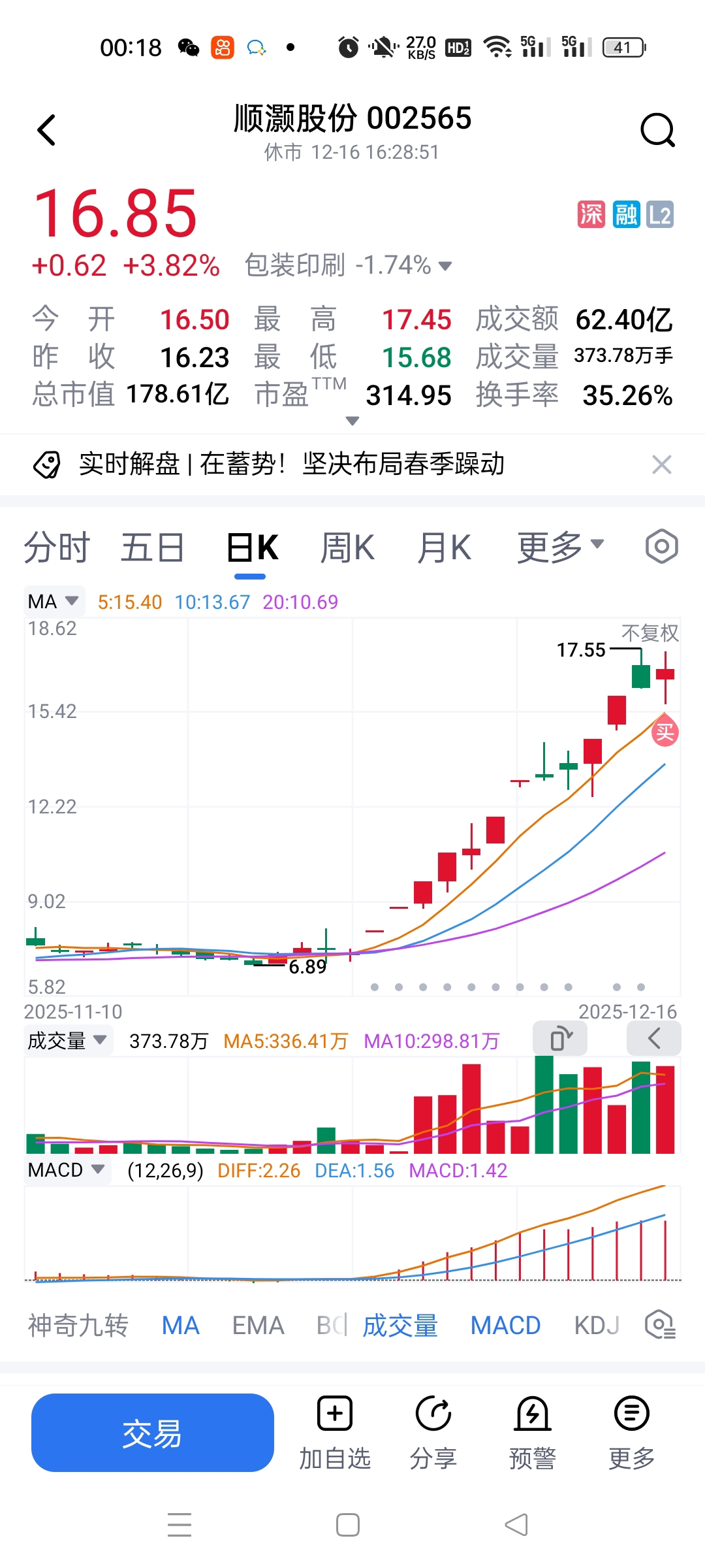 $顺灏股份(SZ002565)$ 今天进了一点,估计行情还没有走完,今天大盘这样,这个股的表现已经非常强势了,17.55肯定不是高点,