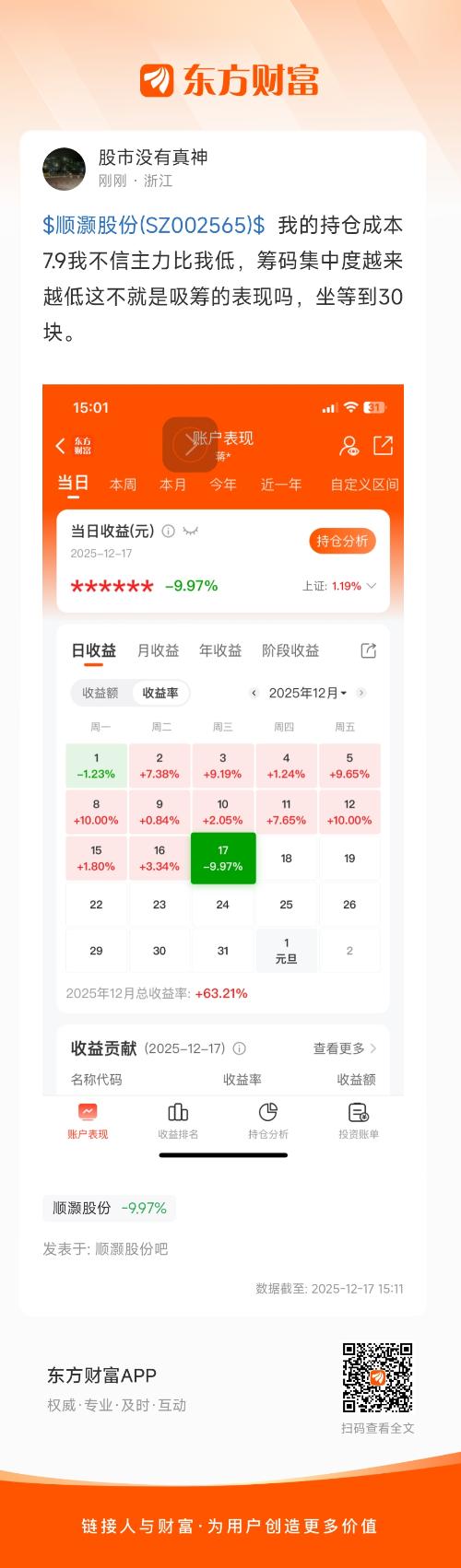 $顺灏股份(SZ002565)$  我的持仓成本7.9我不信主力比我低,筹码集中度越来越低这不就是吸筹的表现吗,坐等到30块。