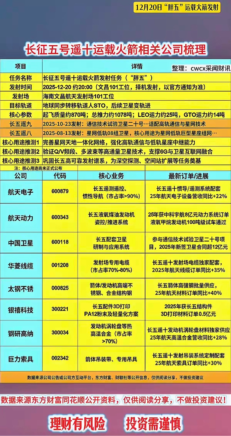 长征五号遥十运载火箭:相关公司梳理!今天晚上20点左右发射。