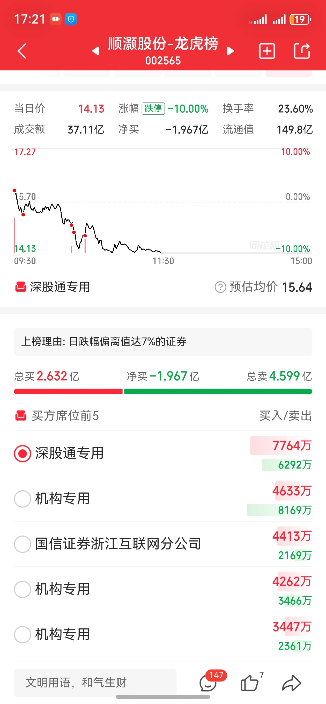 $顺灏股份(SZ002565)$ 人家港股通昨天才能买才进来…就让人家吃面走…真狠啊
