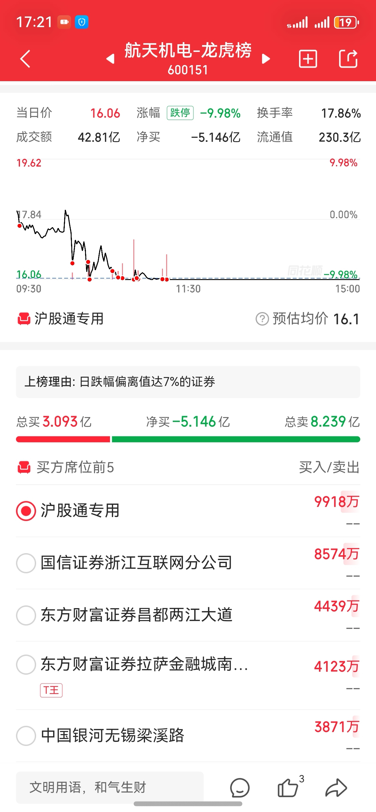$航天机电(SH600151)$ 唯二两个航天跌停的…希望明天你俩负反馈别太大,别带崩了航天板块…太弱了…