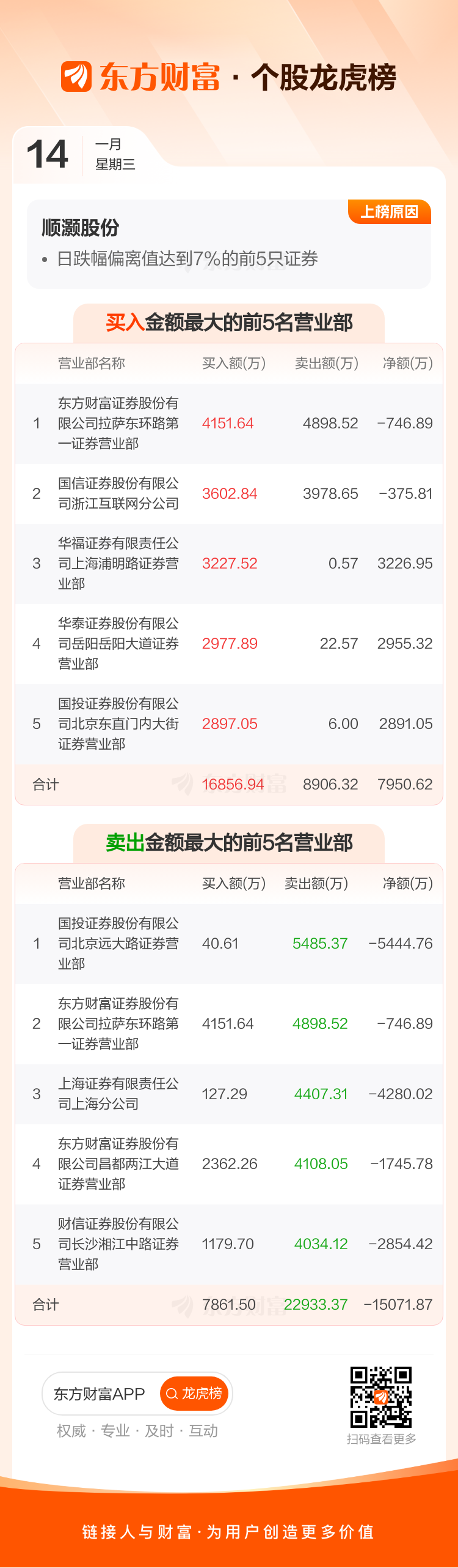 交易所2026年1月14日公布的交易公开信息显示,顺灏股份因成为日跌幅偏离值达到7%的前5只证券上榜。顺灏股份当日收报18.54元,涨跌幅-10.00%,偏离值-10.65%,换手率20.95%,成交额41.72亿。