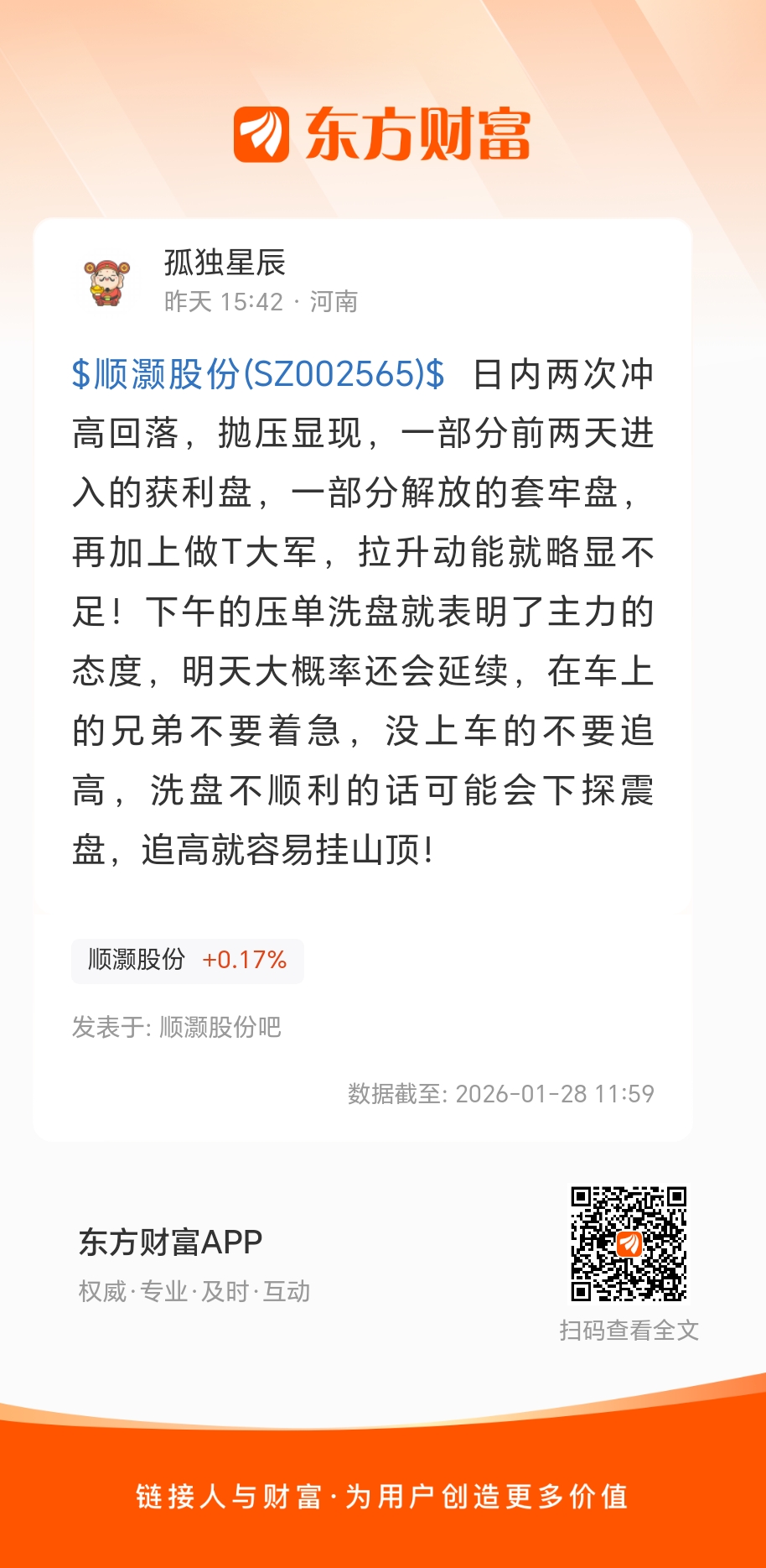 $顺灏股份(SZ002565)$ 日内两次冲高回落,抛压显现,一部分前两天进入的获利盘,一部分解放的套牢盘,再加上做T大军,拉升动能就略显不足!下午的压单洗盘就表明了主力的态度,明天大概率还会延续,在车上的兄弟不要着急,没上车的不要追高,洗盘不顺利的话可能会下探震盘,追高就容易挂山顶!