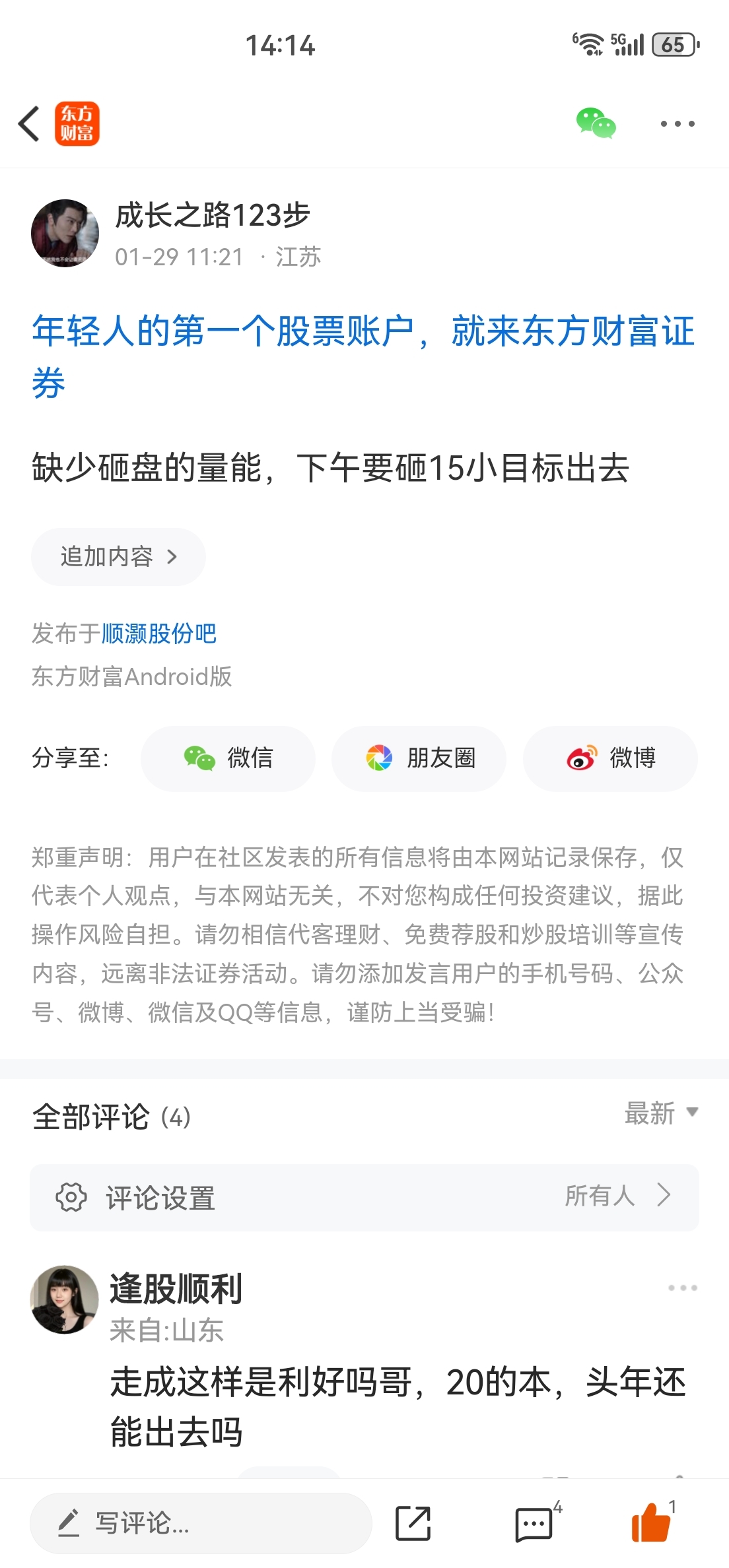 温馨提示: 1.根据《证券法》规定,禁止编造、传播虚假信息或者误导性信息,扰乱证券市场;2.用户在本社区发表的所有资料、言论等仅代表个人观点,与本网站立场无关,不对您构成任何投资建议。用户应基于自己的独立判断,自行决定证券投资并承担相应风险。《东方财富社区管理规定》