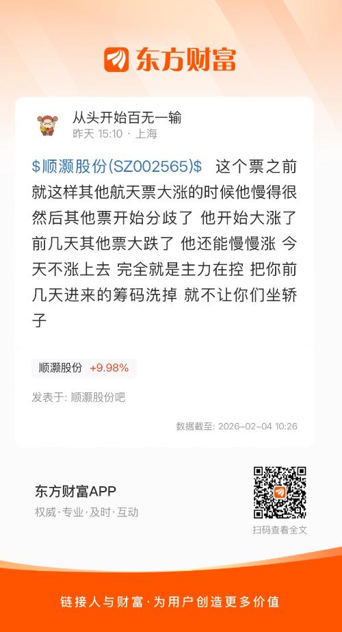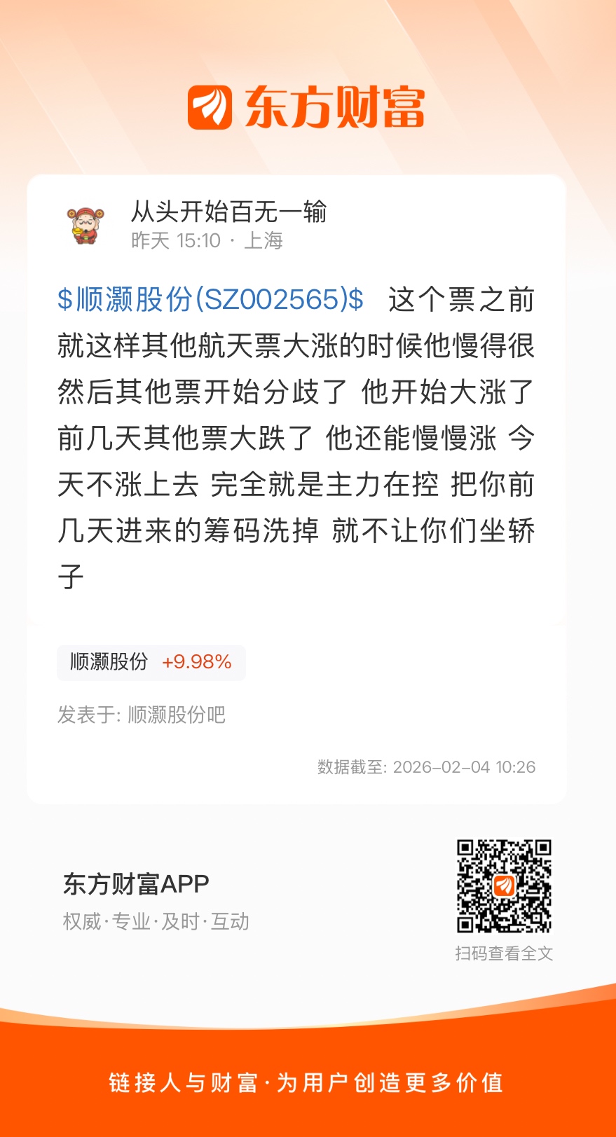 $顺灏股份(SZ002565)$ 这个票之前就这样其他航天票大涨的时候他慢得很 然后其他票开始分歧了 他开始大涨了 前几天其他票大跌了 他还能慢慢涨 今天不涨上去 完全就是主力在控 把你前几天进来的筹码洗掉 就不让你们坐轿子