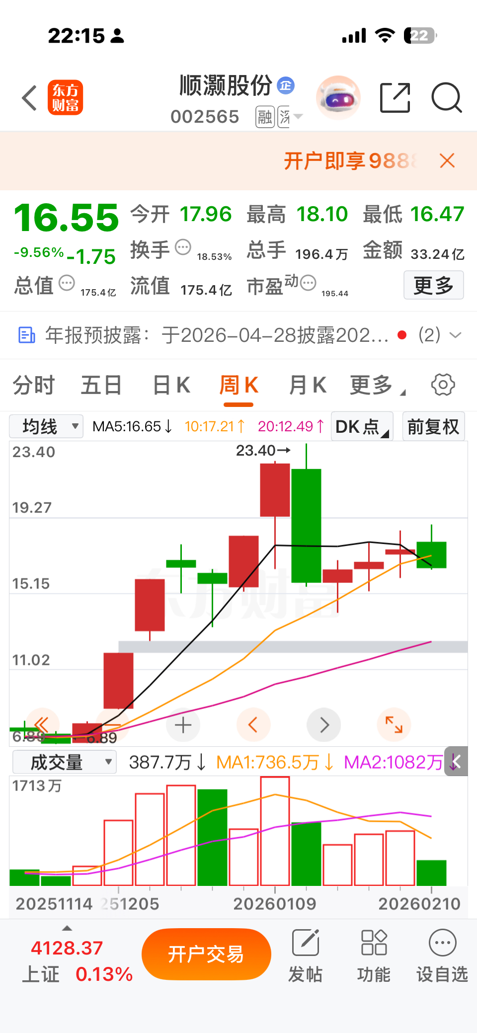 $顺灏股份(SZ002565)$ 今天收盘买,很简单,周线这个位置赌它上十日线,前三周都是习惯性的上,这周四再不上就割掉