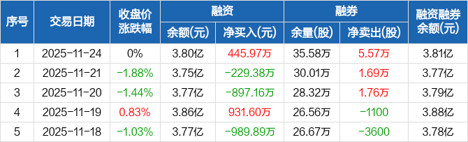 融资方面,当日融资买入1088.28万元,融资偿还642.31万元,融资净买入445.97万元。融券方面,融券卖出5.58万股,融券偿还100股,融券余量35.58万股,融券余额167.23万元。融资融券余额合计3.81亿元。