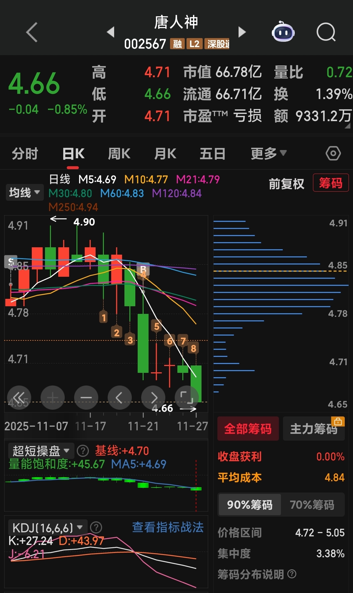 $唐人神(SZ002567)$ 该建仓了4.66 ,下一个加仓点4.47