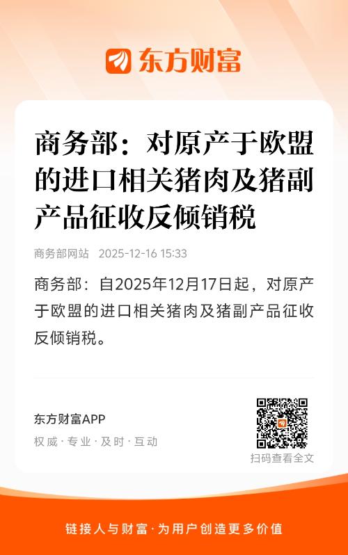 根据《反倾销条例》第三十八条的规定,商务部向国务院关税税则委员会提出征收反倾销税的建议,国务院关税税则委员会根据商务部的建议作出决定,自2025年12月17日起,对原产于欧盟的进口相关猪肉及猪副产品征收反倾销税。