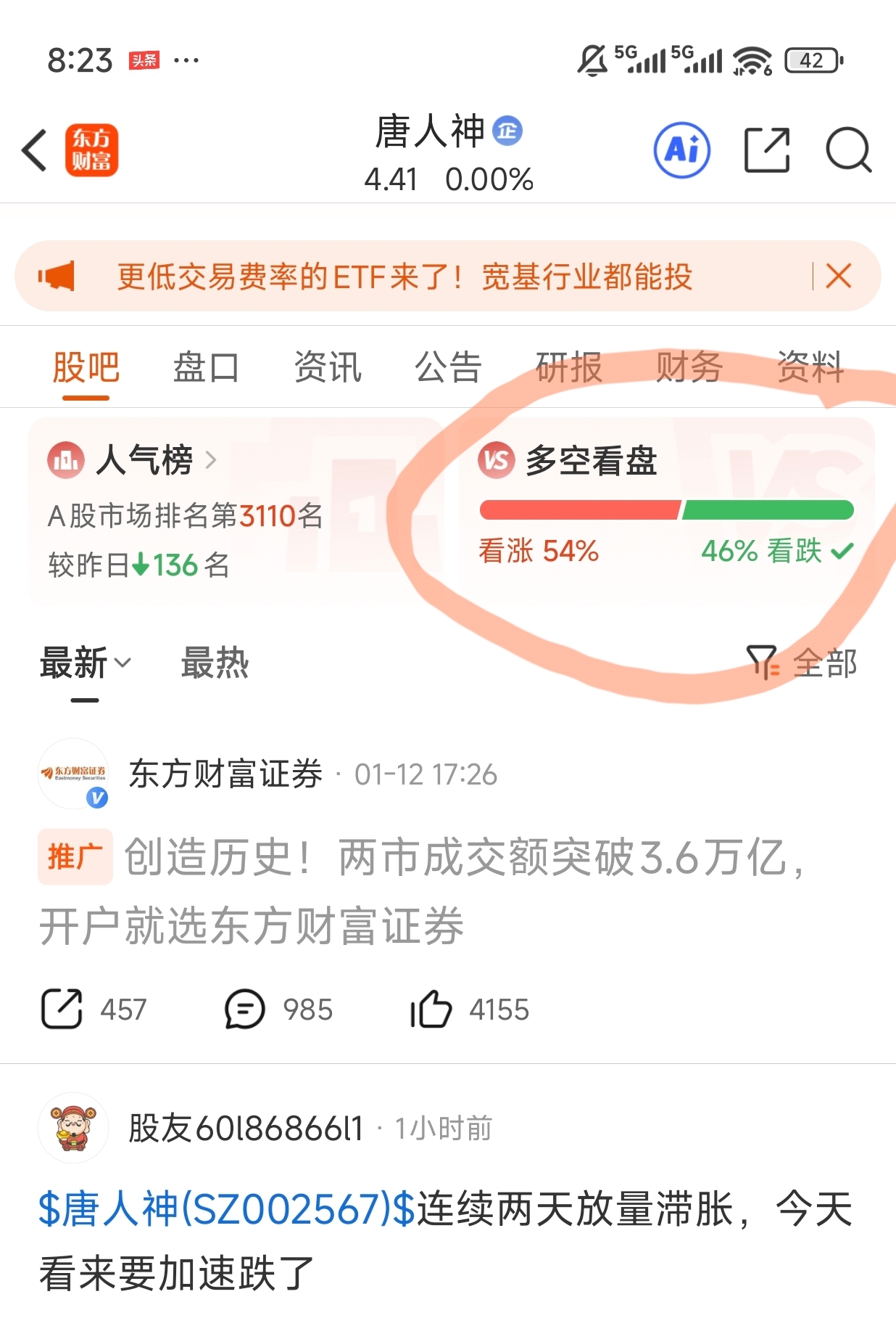 就这样还有54%的人看涨,这股绝对没有跌到位。不跌破4块坚决不进场。