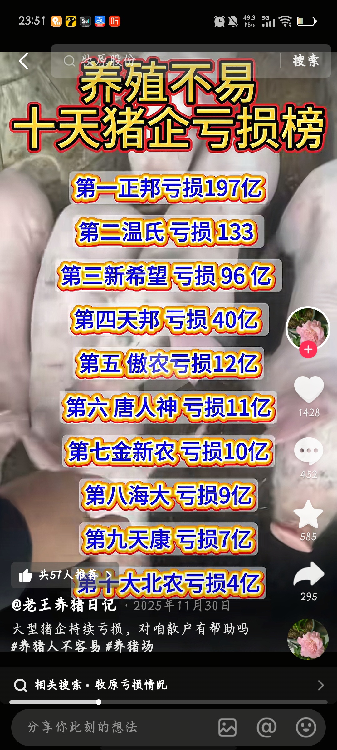 $唐人神(SZ002567)$ 十一月份就出来亏损消息我也没见跌。这些人空g真无敌。。