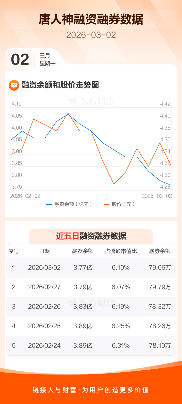 交易所最新数据显示,唐人神于2026年3月2日获融资买入786.81万元,融资偿还958.44万元,当日融资净偿还171.62万元。目前,该股融资余额3.77亿,占流通市值比例为6.10%。