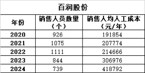 公司业绩好不好看看销售人员数量和人均薪酬,2020-2024年报显示百润销售人员