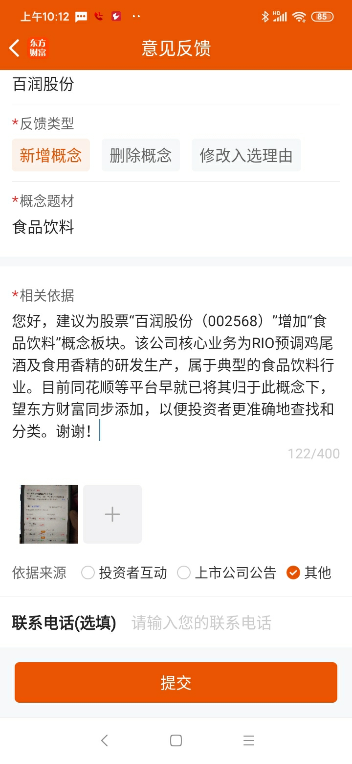 您好,建议为股票“百润股份(002568)”增加“食品饮料”概念板块。该公司核心业务为RIO预调鸡尾酒及食用香精的研发生产,属于典型的食品饮料行业。目前同花顺等平台早就已将其归于此概念下,望东方财富同步添加,以便投资者更准确地查找和分类。谢谢!
