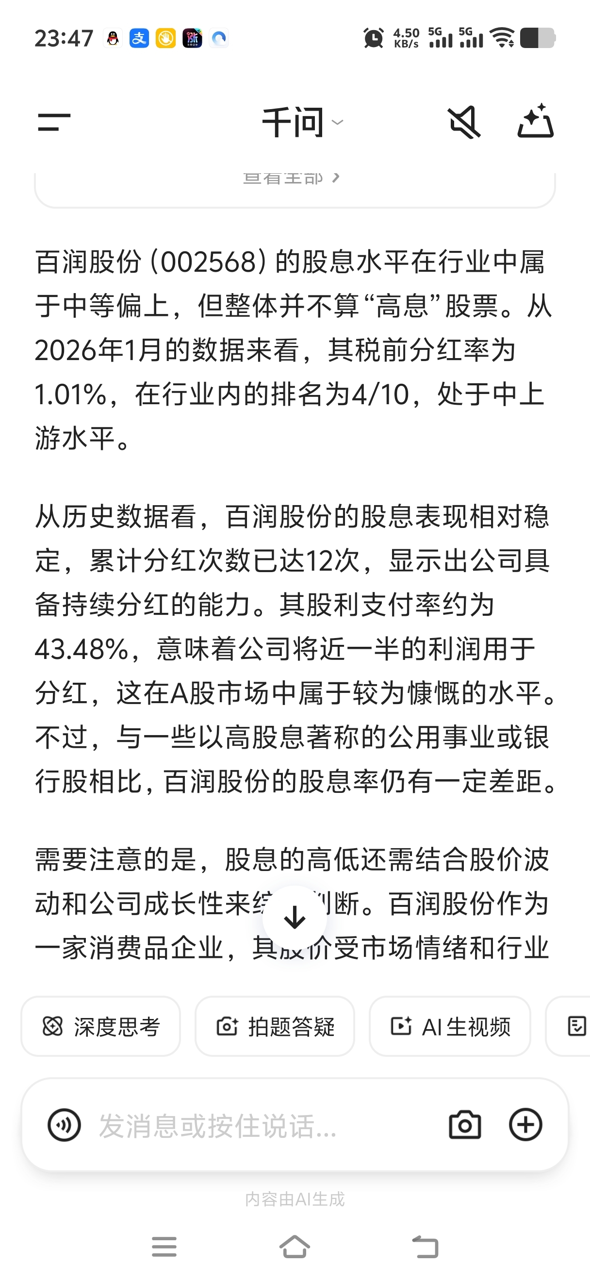百润的股息属于中等偏上