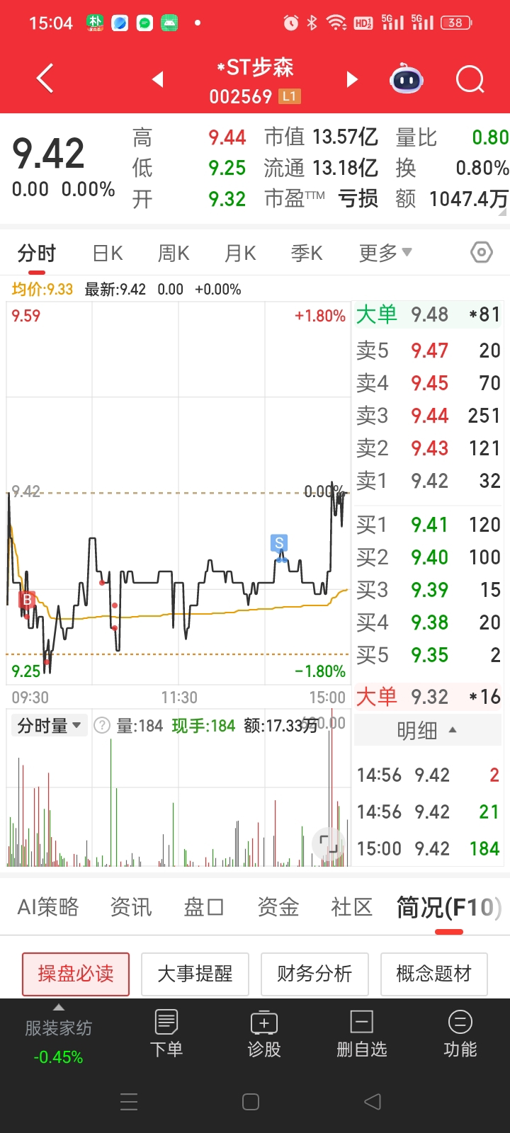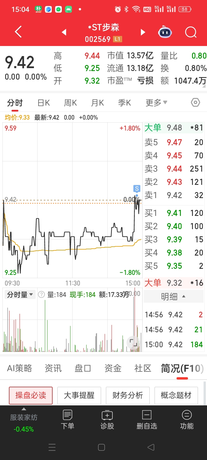 $*ST步森(SZ002569)$ 这个时候步森的优越性就显示出来了,跌下来就是送钱的,丝毫不用考虑大盘……加了点仓位做个小踢,这货真考验耐心和人性,两个账户又双叒叕赚钱了,在步森跌跌不休过程中……就问你服不服林北公啊,步森之王,步森king……