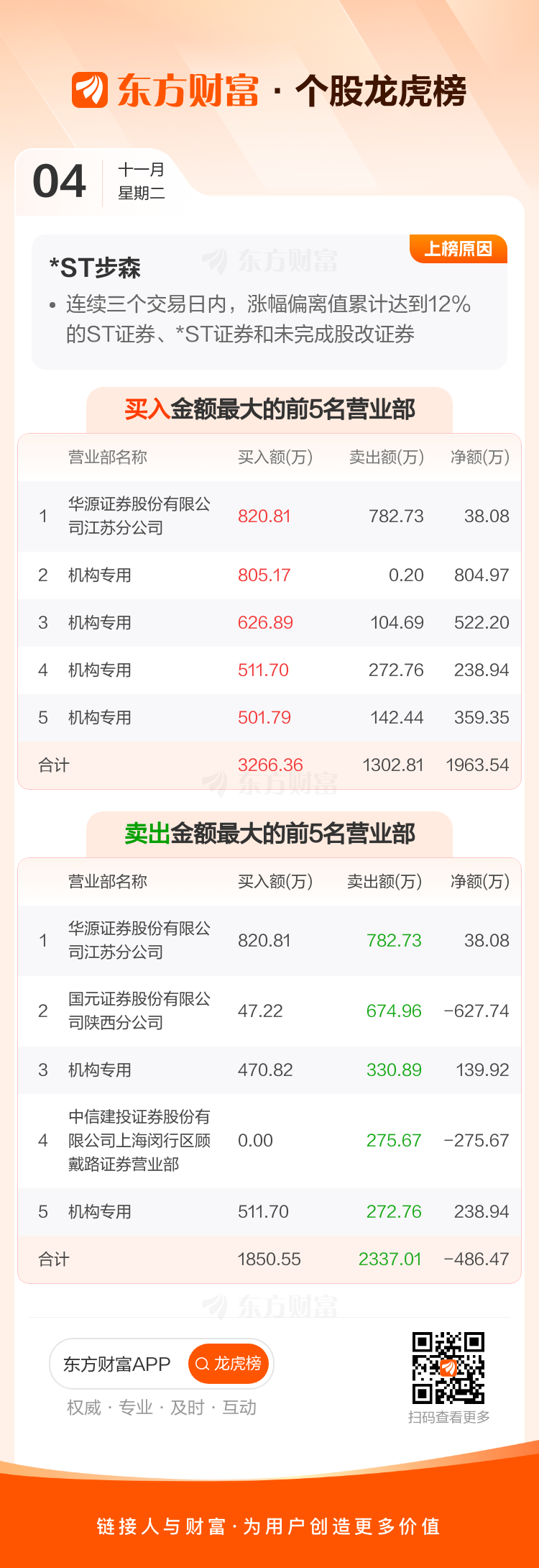 交易所2025年11月4日公布的交易公开信息显示,*ST步森因成为连续三个交易日内,涨幅偏离值累计达到12%的ST证券、*ST证券和未完成股改证券上榜。*ST步森当日收报10.42元,涨跌幅4.83%,换手率4.01%,成交额5758.06万。异常期间10月31日至11月4日,期间涨幅11.09%,累计偏离值12.32%,区间成交额1.25亿。