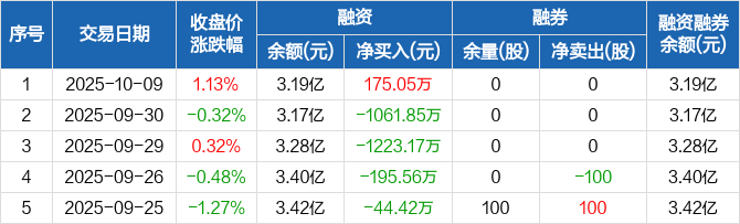 融资方面,当日融资买入2602.99万元,融资偿还2427.94万元,融资净买入175.05万元。融券方面,融券卖出0股,融券偿还0股,融券余量0股,融券余额0元。融资融券余额合计3.19亿元。