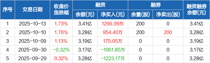 融资方面,当日融资买入3875.01万元,融资偿还2608.92万元,融资净买入1266.09万元,连续3日净买入累计2395.54万元。融券方面,融券卖出0股,融券偿还0股,融券余量200股,融券余额1292元。融资融券余额合计3.41亿元。