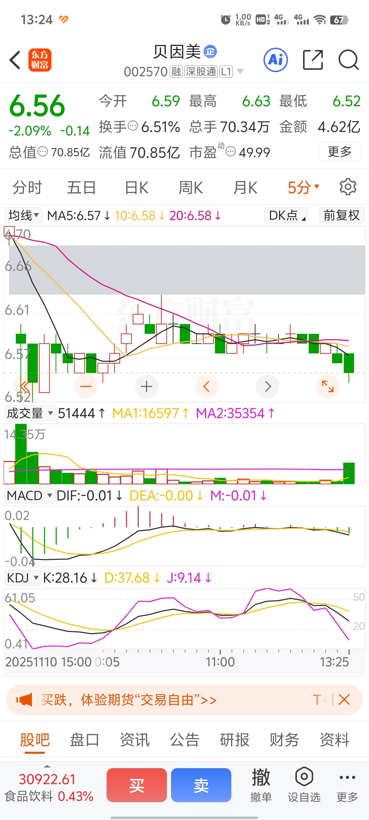 $贝因美(SZ002570)$ 快跑,5分钟均线向下了。