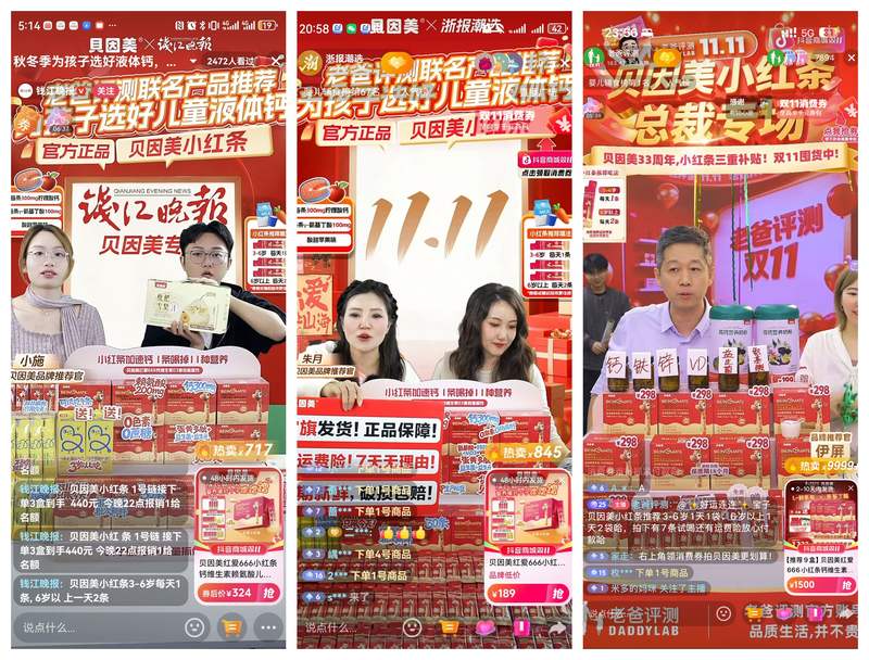 钱江晚报、浙报传媒、老爸评测--双11直播现场,共同推荐贝因美小红条液体钙。企业供图
