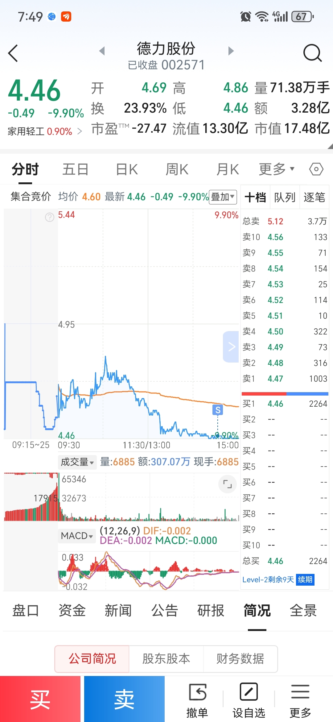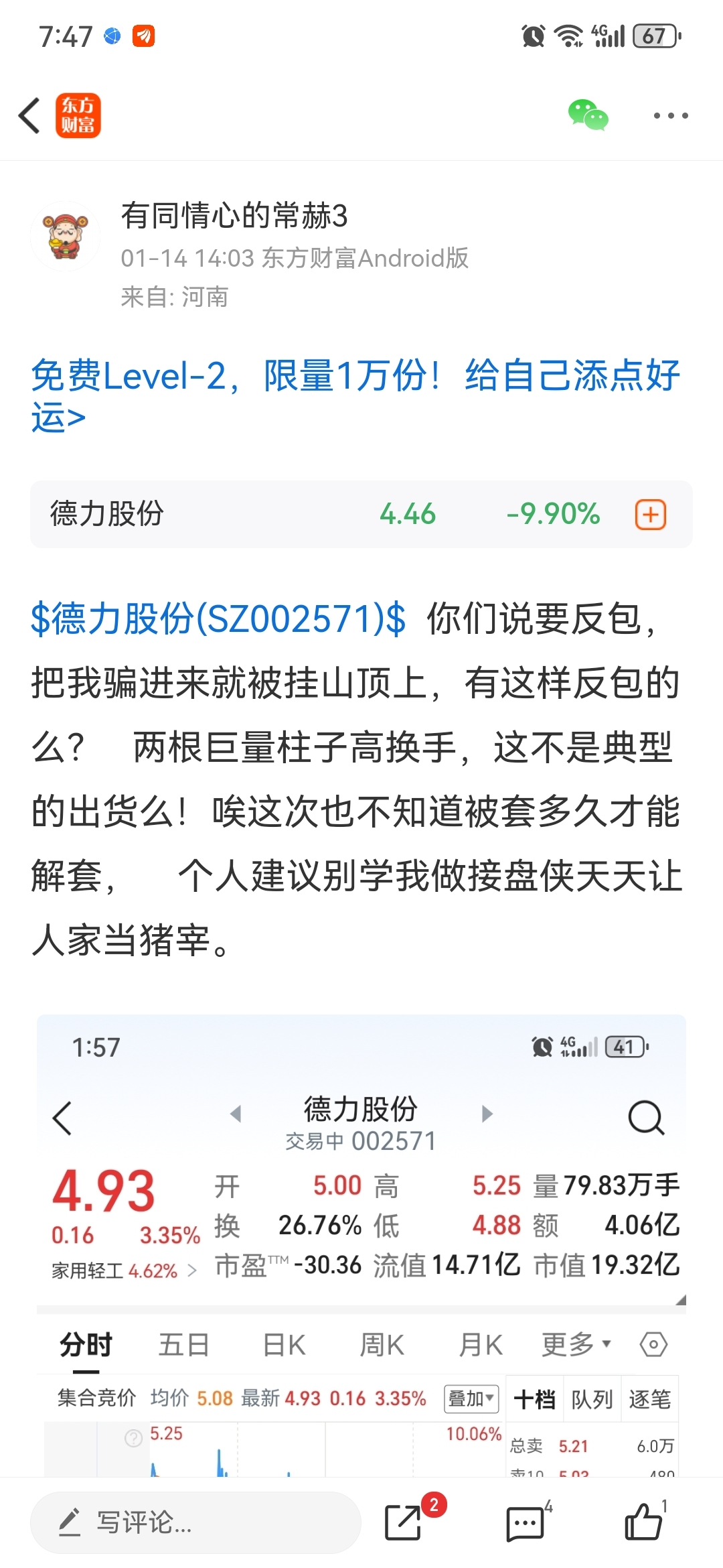 $德力股份(SZ002571)$ 14号的时候5.13入场 后面看到有个2B在里面使劲唱多,就知道要完蛋,一直在劝不要轻易入套,你们不听。 有两个选择,1割肉离场,就是有点痛。2拿着不动继续补仓做T 但是不知道啥时候是个头。