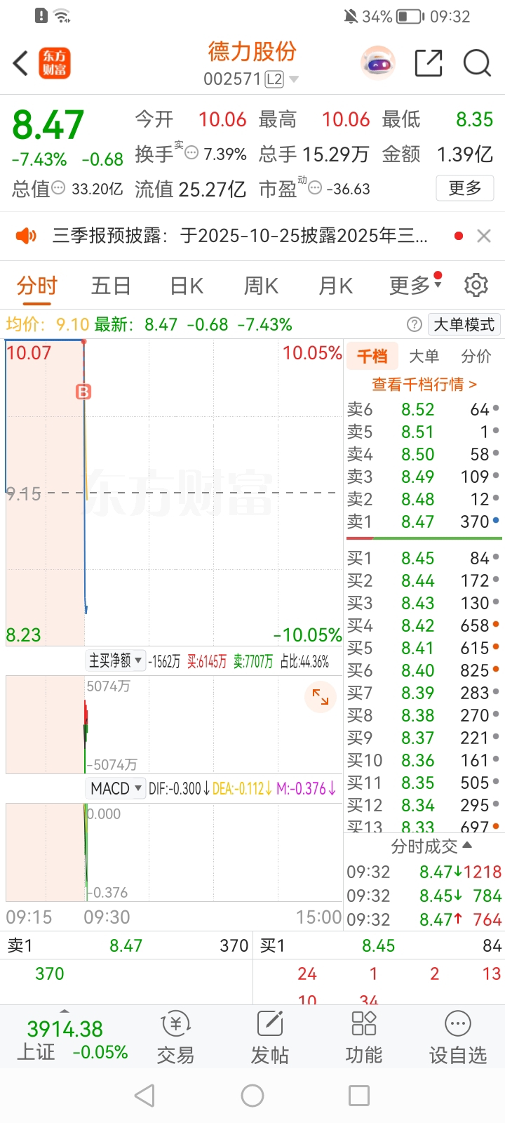 好消息∶元成前天跑出去了!坏消息:今天打板德力股份天地板亏二十个点!相当在元成吃