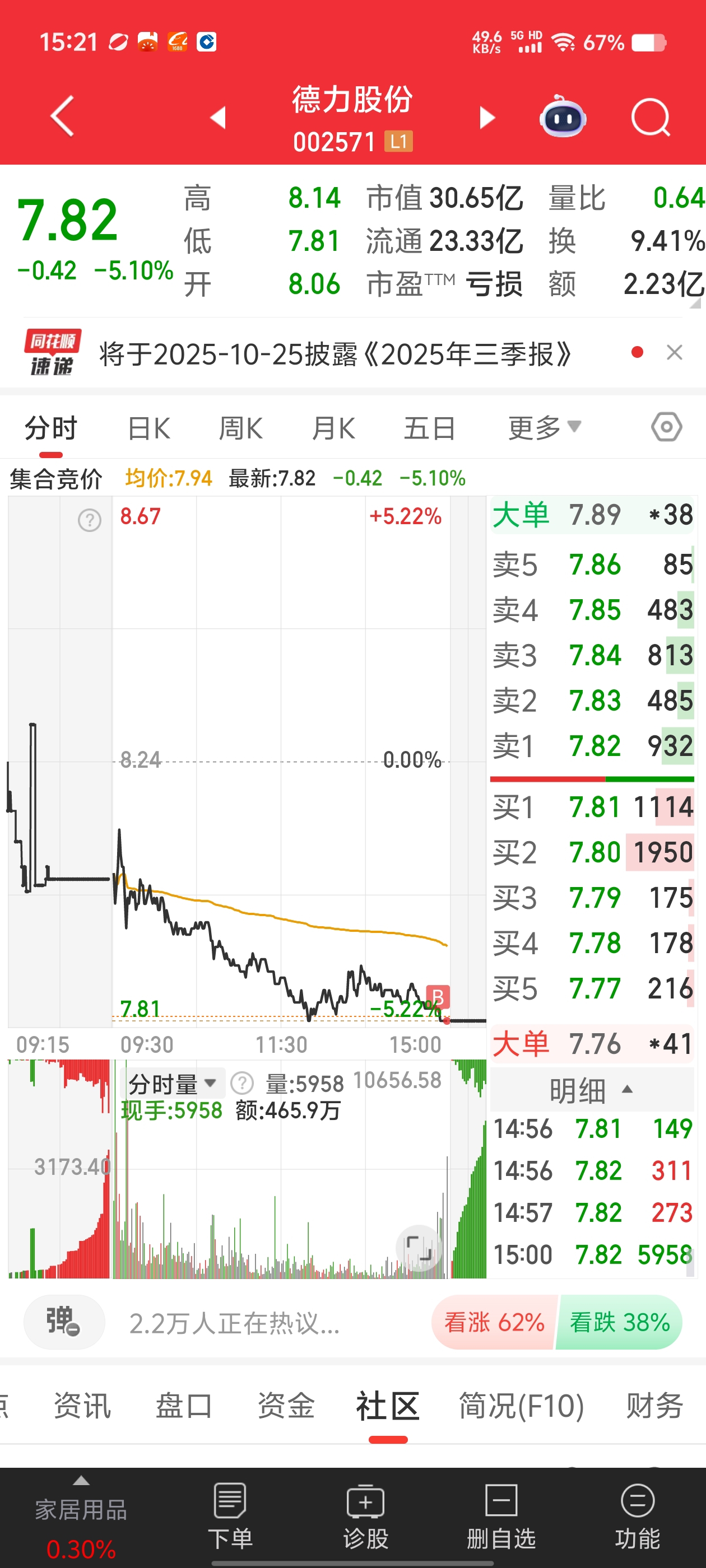 $德力股份(SZ002571)$ 还真成交了,挂了10个,没想到收盘真成交了,明天能红着出来嘛