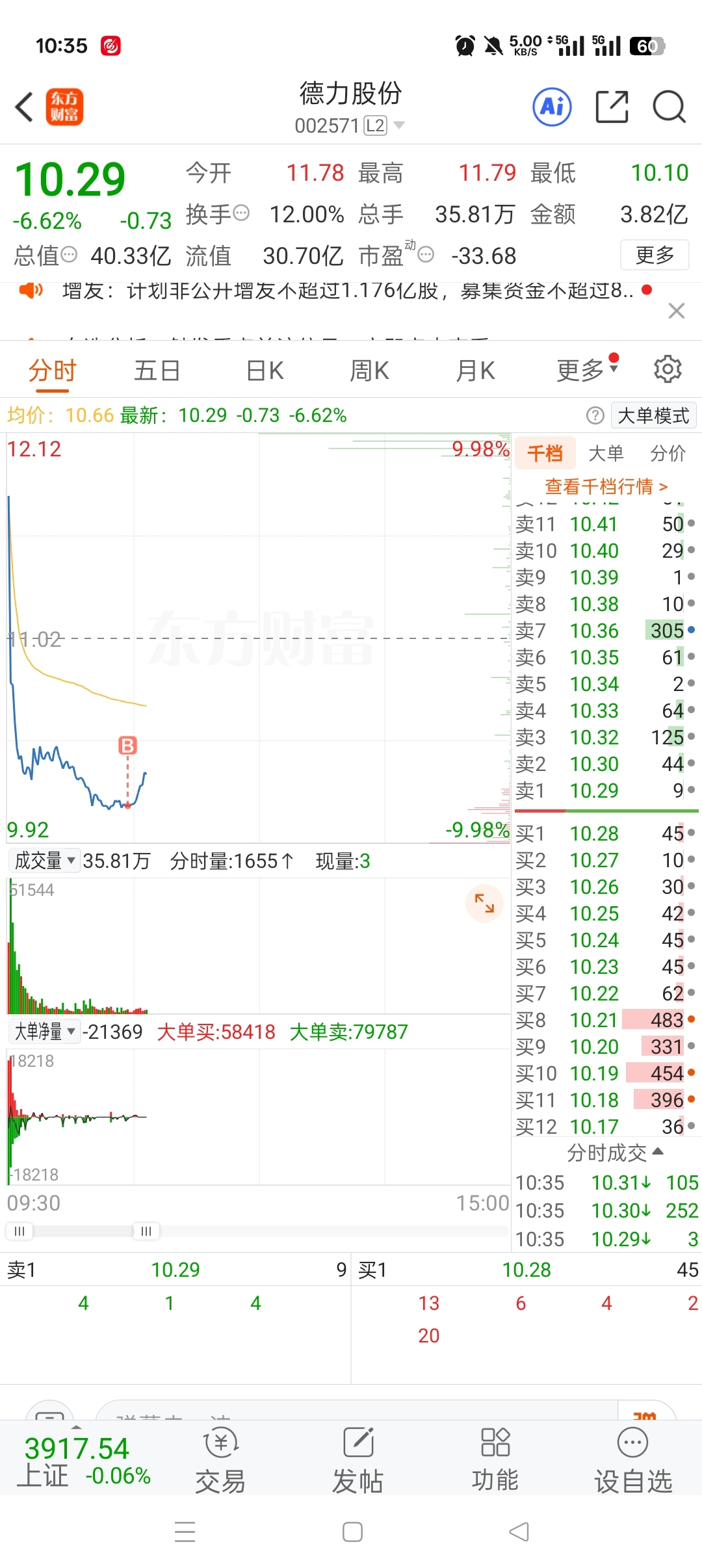 $德力股份(SZ002571)$ 10.11元 一成仓位看戏,没有资金了,等明天卖了别的股票再补吧,你今天千万别拉上去,最好跌停,明天低开让我补仓